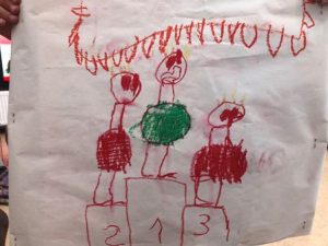 Tijdens het thema kunst maakten wij dit moederdagcadeau. Eerst maakten de kinderen de achtergrond met waterverf. Geïnspireerd op verschillende kunstenaars werden dit kunstige achtergronden met strepen, stippen, cirkels, spetters, lijnen en vlakken. Daarna tekenen de kinderen hun moeder met zwarte stift op een stevig vel wit papier. De tekeningen werden ingekleurd met kleurpotlood en uitgeknipt. De kinderen vouwden een muizentrap van twee halve repen papier. De muizentrap werd op de achterkant van de tekening van mama geplakt en op de achtergrond bevestigd. Zo sprong mama UIT DE KUNST!