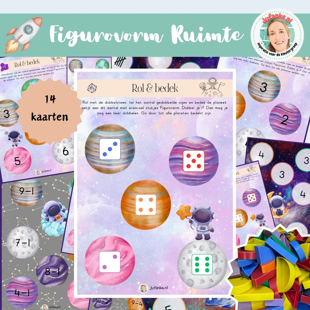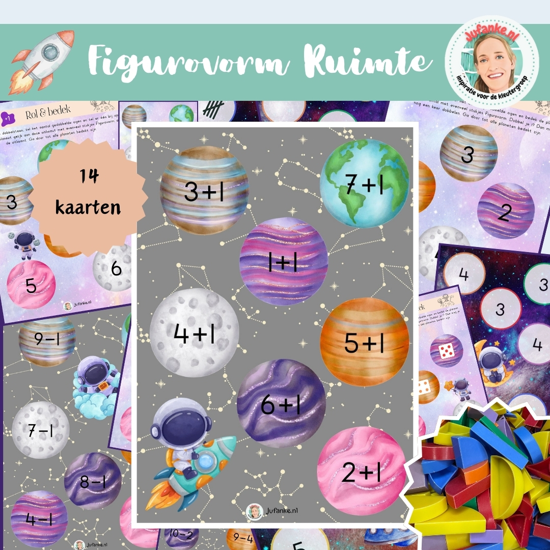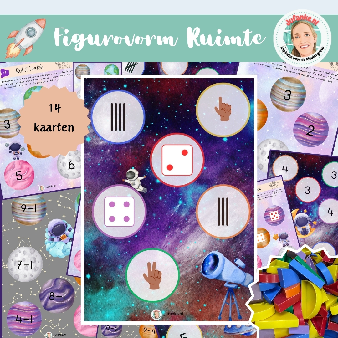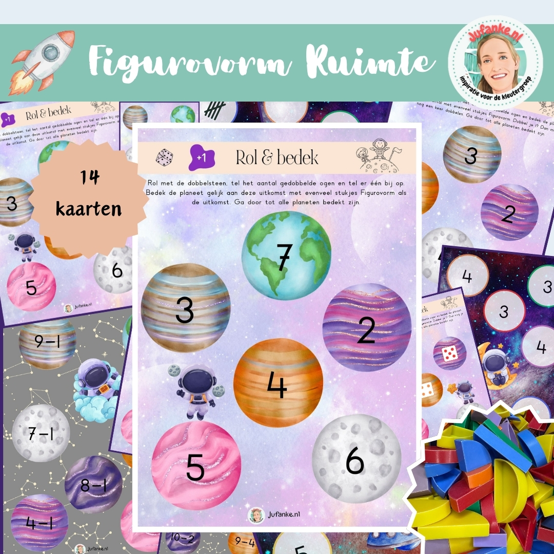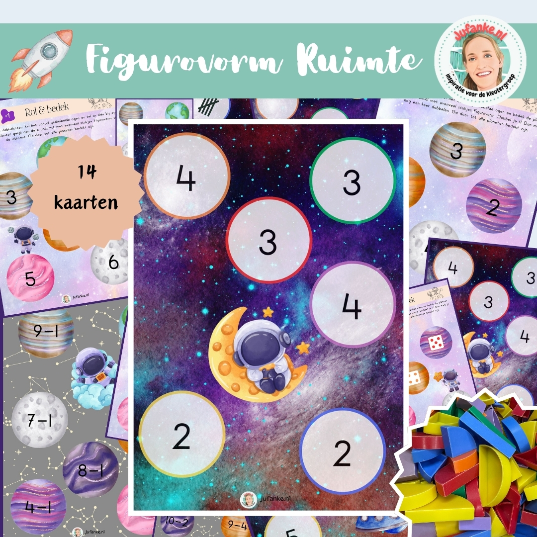 Bij dit materiaal maakte ik opdrachtkaarten in het thema ‘de ruimte / het heelal’. Super leuk voor de spelinloop, de speel-/werkles of het aanbieden van een specifiek doel zoals het werken met kleuren, getalsymbolen, getalbeelden en inzicht.