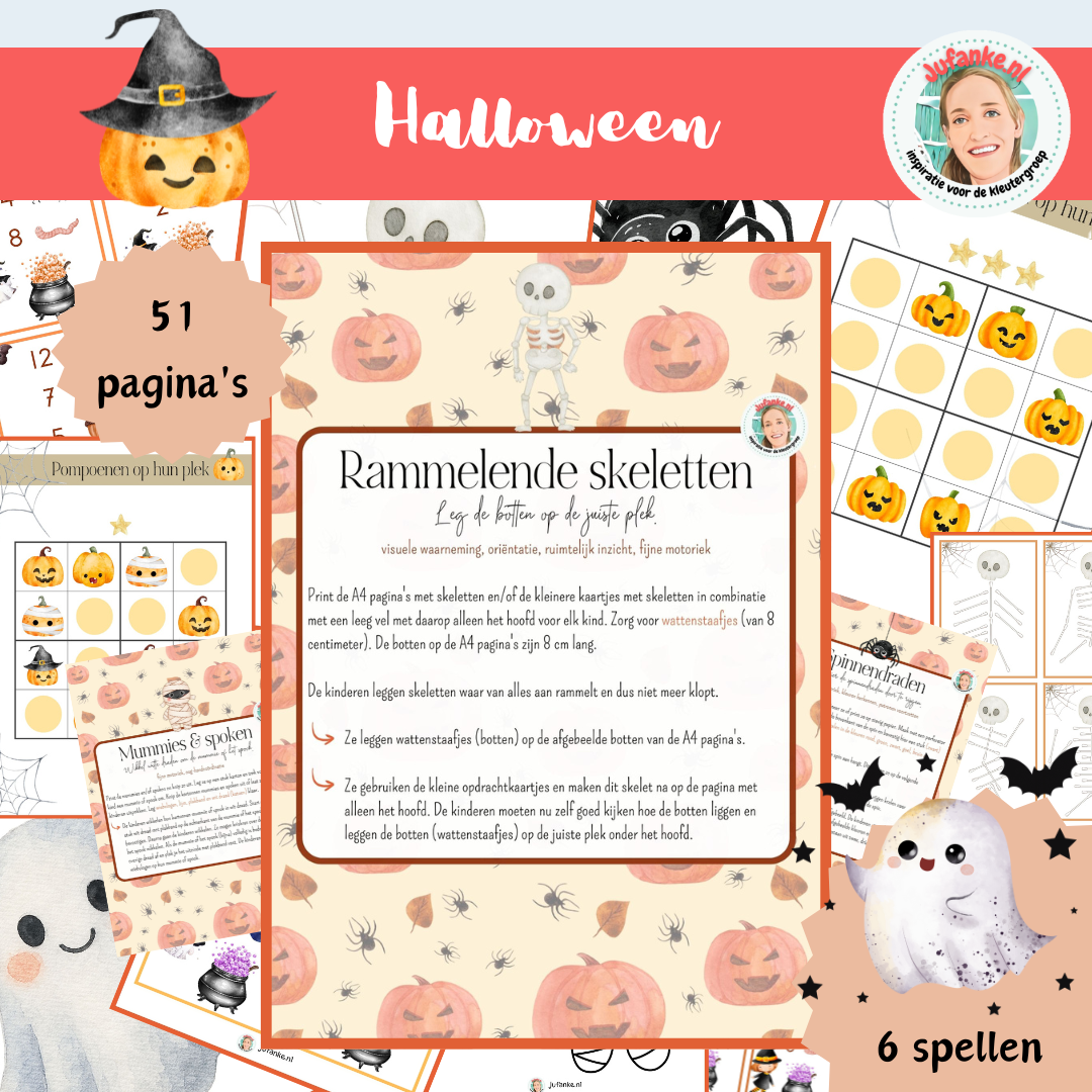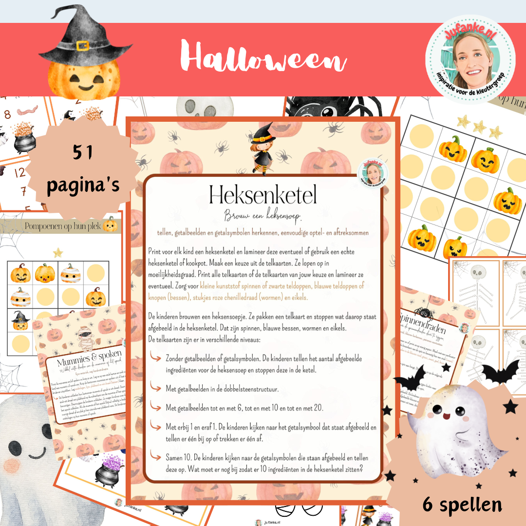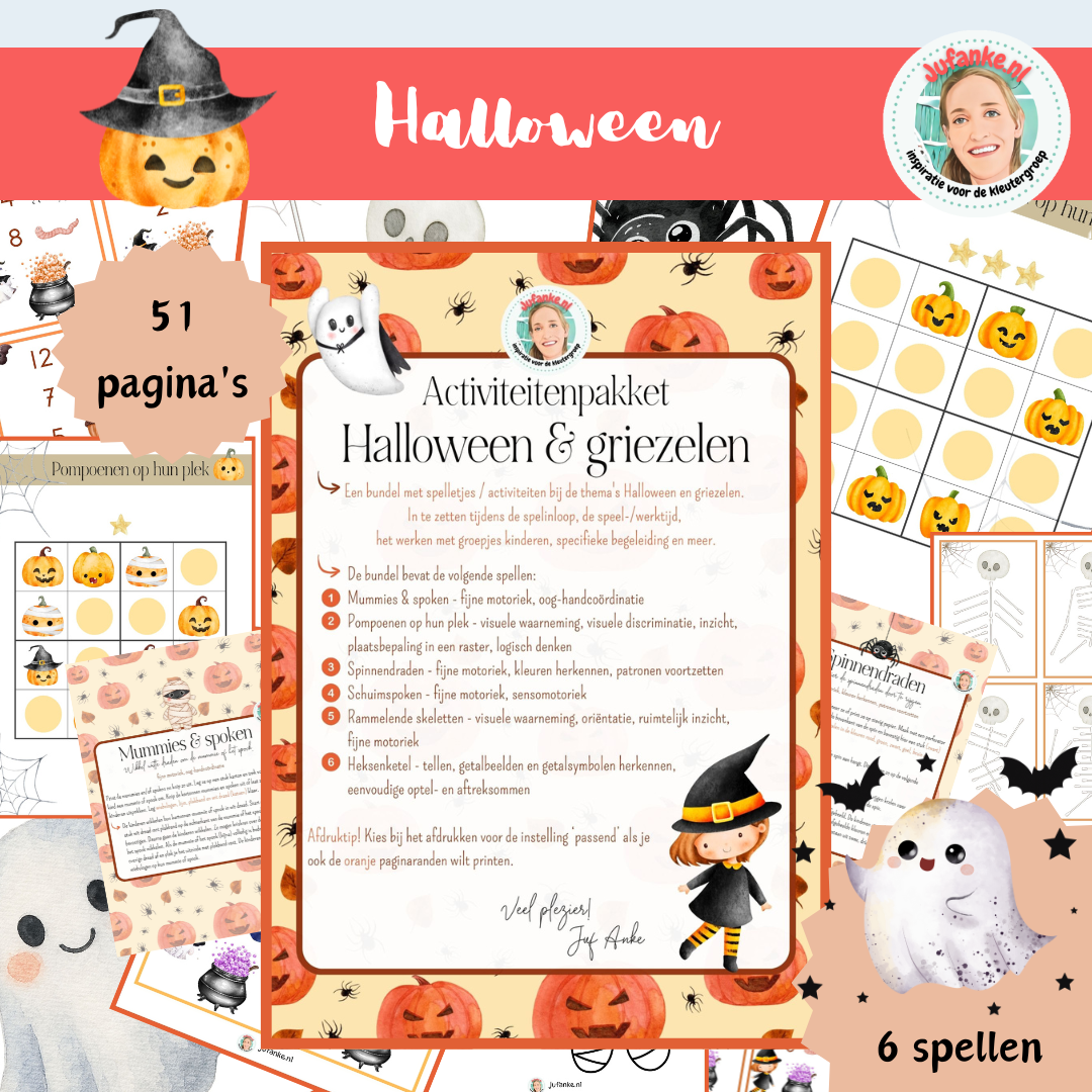 Deze digitale download van 51 pagina’s bevat 6 activiteiten / spellen voor kleuters en peuters bij de thema’s Halloween & griezelen om in te zetten tijdens de spelinloop, de speel-/werktijd, het werken met groepjes kinderen, specifieke begeleiding en meer.