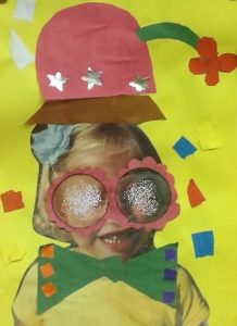 Maak een portretfoto van elk kind en laat ze verkleedkleding en attributen uit gekleurd papier knippen. Hiermee kleden ze het portret aan.