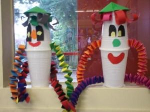 Lijm twee bekers op elkaar en laat de kinderen ze omtoveren tot carnavalsfiguren zoals clowns.