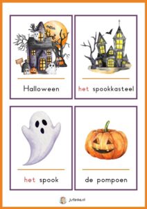 Een set woordkaarten met lidwoord bij de thema’s ‘Halloween’ en ‘griezelen’.