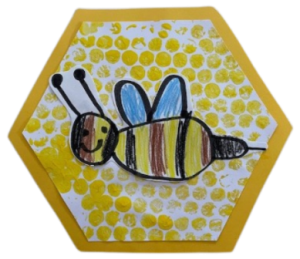 De kinderen tekenen een bij met zwarte stift en kleuren deze in met kleurpotlood. Ze smeren met een kwast gele verf op noppenfolie en drukken daar een zeshoekig stuk wit papier op. De bij wordt op het zeshoekige stuk papier geplakt.