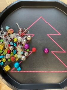 Teken of plak met tape een kerstboom in de tuff-tray (activiteitenbak) en leg er allerlei kerstboomversiering naast. De kinderen versieren de kerstboom.