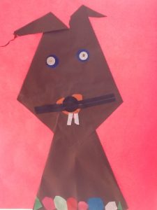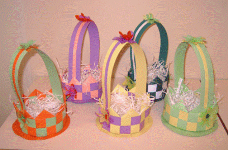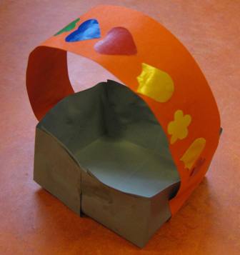 Dit is het mandje van de paashaas. Om de beurt huppelt een kind met het mandje een rondje door de klas. De klas zingt: