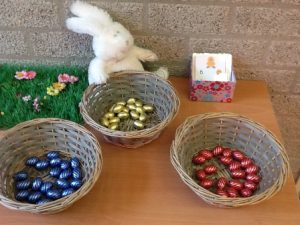 Tel alle eieren uit de zak. Tel ze één voor één, leg ze in een rij, geef elk kind een ei, maak groepjes van vijf of tien, verdeel eieren over mandjes etc. Wees creatief en maak hier een leuke rekenactiviteit van!