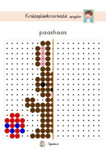 Help de paashaas met het bezorgen van de eieren. De kleuters leggen pijlen in een raster en oefenen hierbij het tellen, de getalsymbolen, het ruimtelijk inzicht en de beginselen van programmeren.