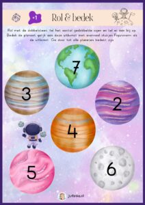 Gooi met de dobbelsteen en schiet de raket naar de maan. Oefen het tellen en de getalbeelden op de dobbelsteen zo spelenderwijs.