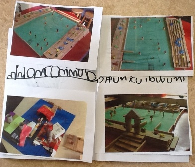 Laat de kinderen een voetbal-, atletiek of zwemstadion in de bouwhoek maken. Het stadion kan met grote blokken, kleine blokken of Kapla gebouwd worden. Geef de kinderen een groen, bruin of blauw vel Engels karton dat als basis dient.